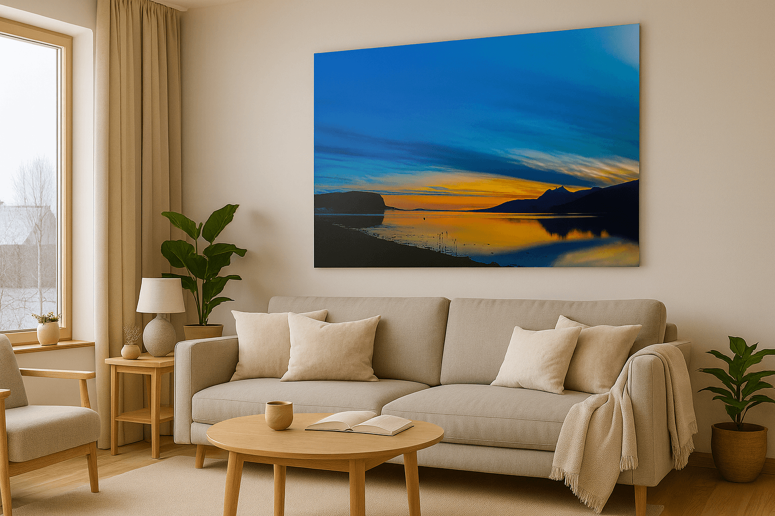 Fang øyeblikket der en gyllen solnedgang smelter sammen med et blikkstille hav. Dette kunstfotografiet bringer en følelse av ro, varme og harmoni inn i hjemmet, med solens glød som møter himmelens dype blåtoner i et magisk fargespill.