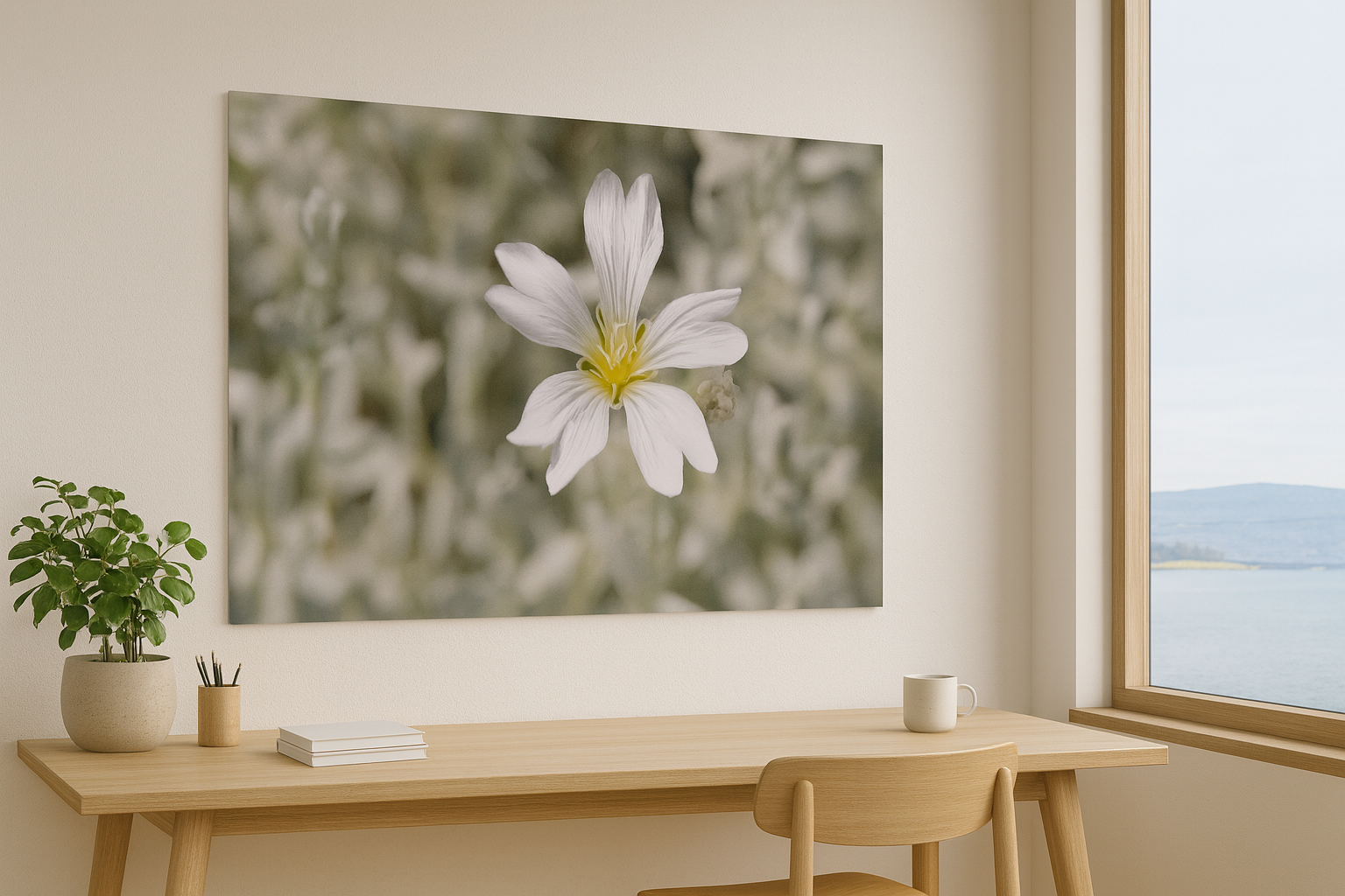 Gi hjemmet ditt et snev av ro og eleganse med dette delikate kunstfotografiet av en hvit blomst i full blomst. Den myke bakgrunnen og de sarte kronbladene skaper en harmonisk balanse mellom enkelhet og skjønnhet, perfekt for en stilren og avslappende atmosfære. Dette veggbildet passer like godt i en lys stue, et moderne soverom eller et inspirerende kontor.