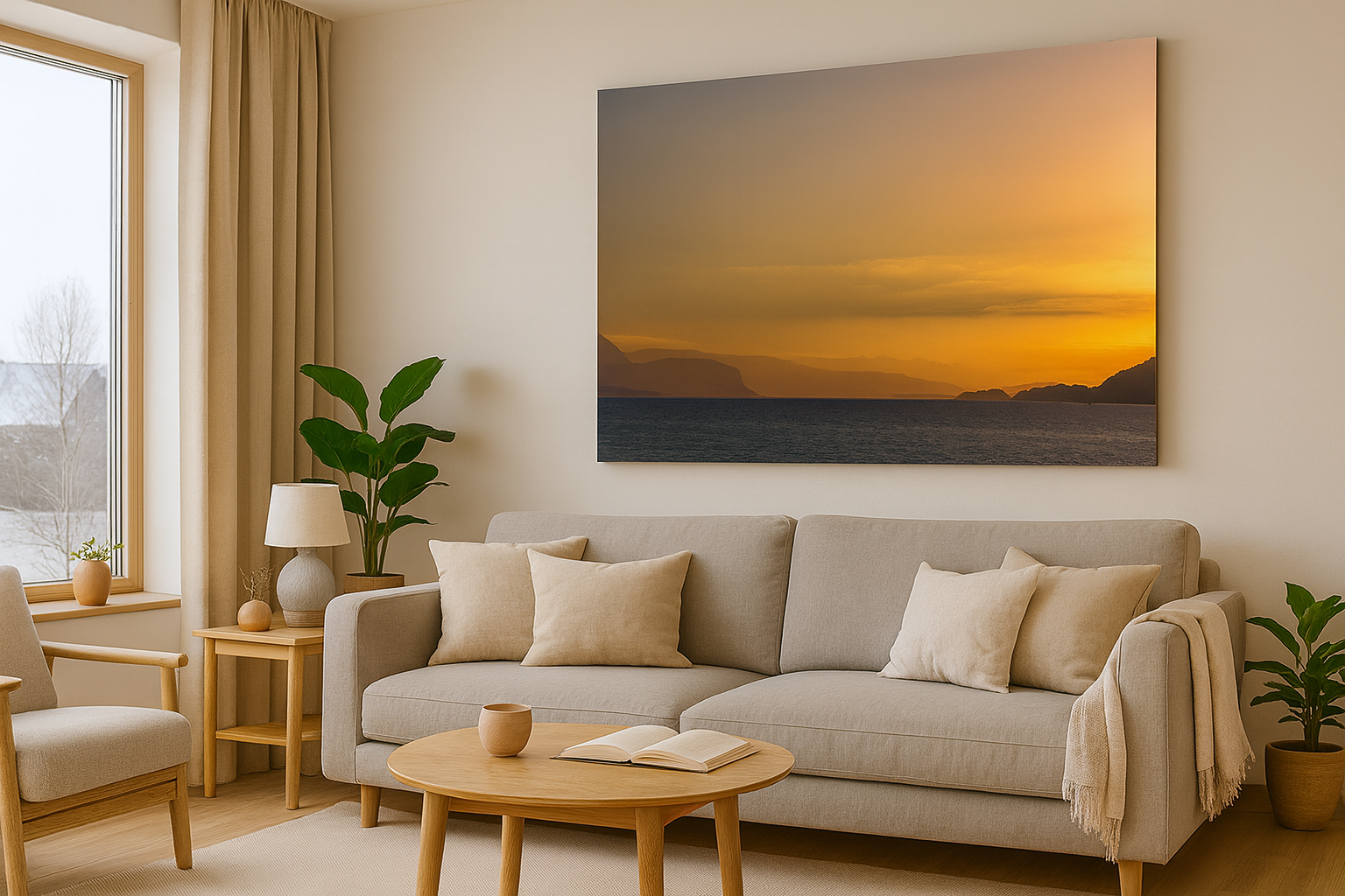 Når solen synker bak de norske fjellene, oppstår en stillhet som ikke kan forklares – bare føles. Dette fotografiet fanger nettopp det: en varm solnedgang over fjorden, der lyset og landskapet smelter sammen i dype nyanser av gull, blått og silhuett.
