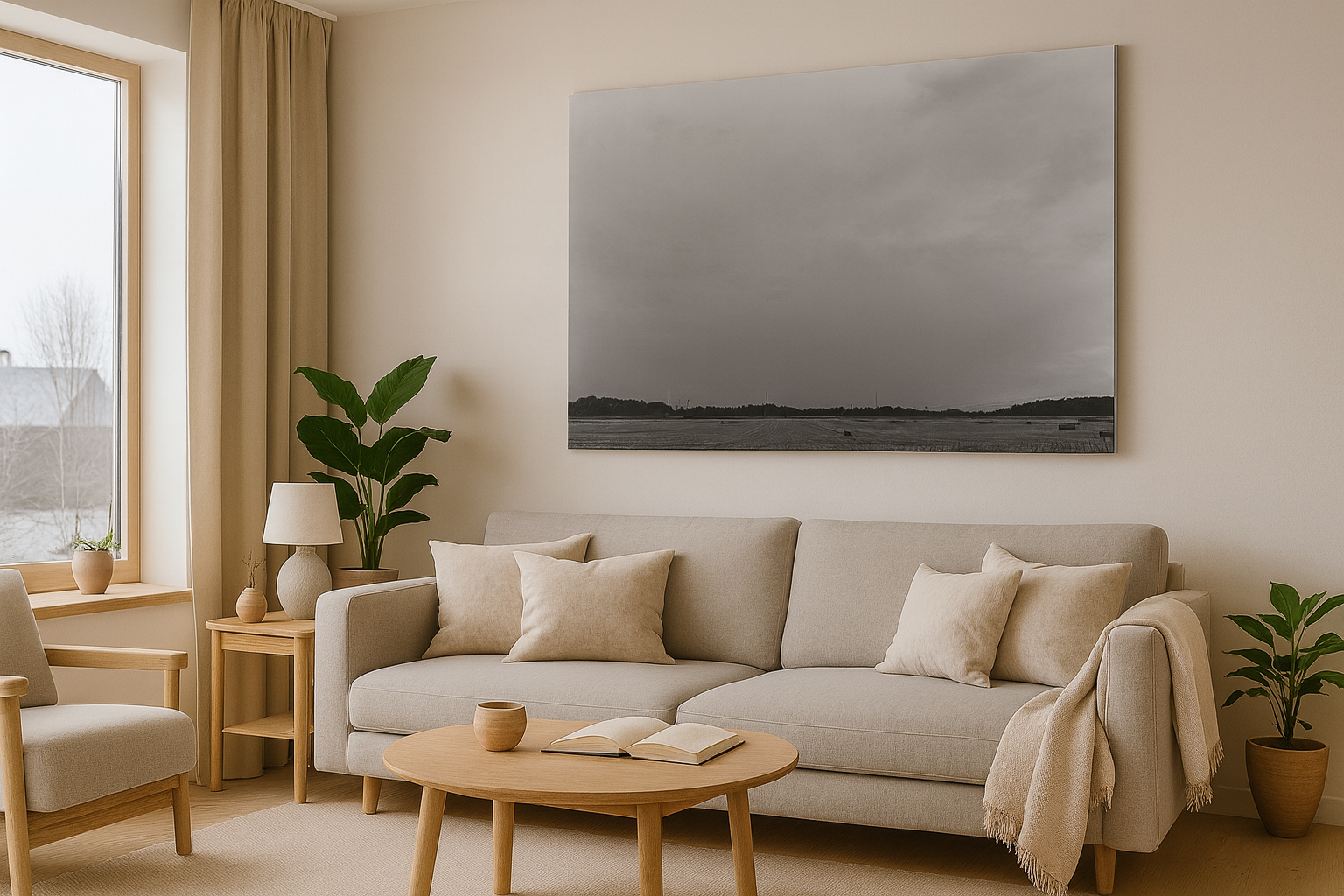 Dette stilrene sort-hvitt-fotografiet fanger en rolig horisont der himmelen glir over i myke, nesten maleriske nyanser. Den enkle komposisjonen gir motivet en følelse av uendelighet og stillhet, noe som gjør det til et tidløst og balansert innslag på veggen.