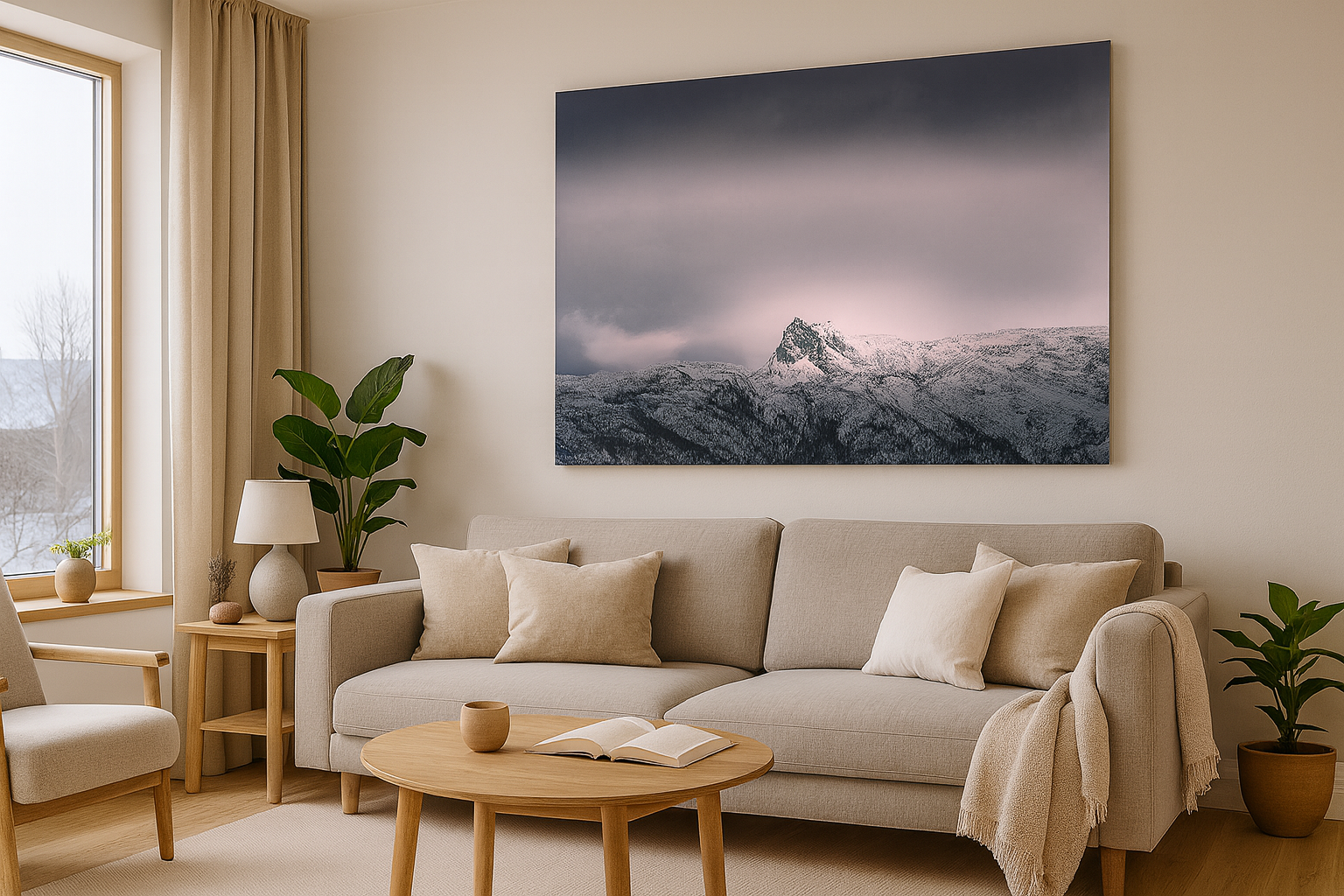 La deg fange av det dramatiske lyset som treffer en snødekt fjelltopp i et stille, nesten høytidelig øyeblikk. Dette eksklusive veggbildet kombinerer nordisk minimalisme med en dyp og mektig atmosfære, og gir rommet en følelse av ro, eleganse og klar luft.