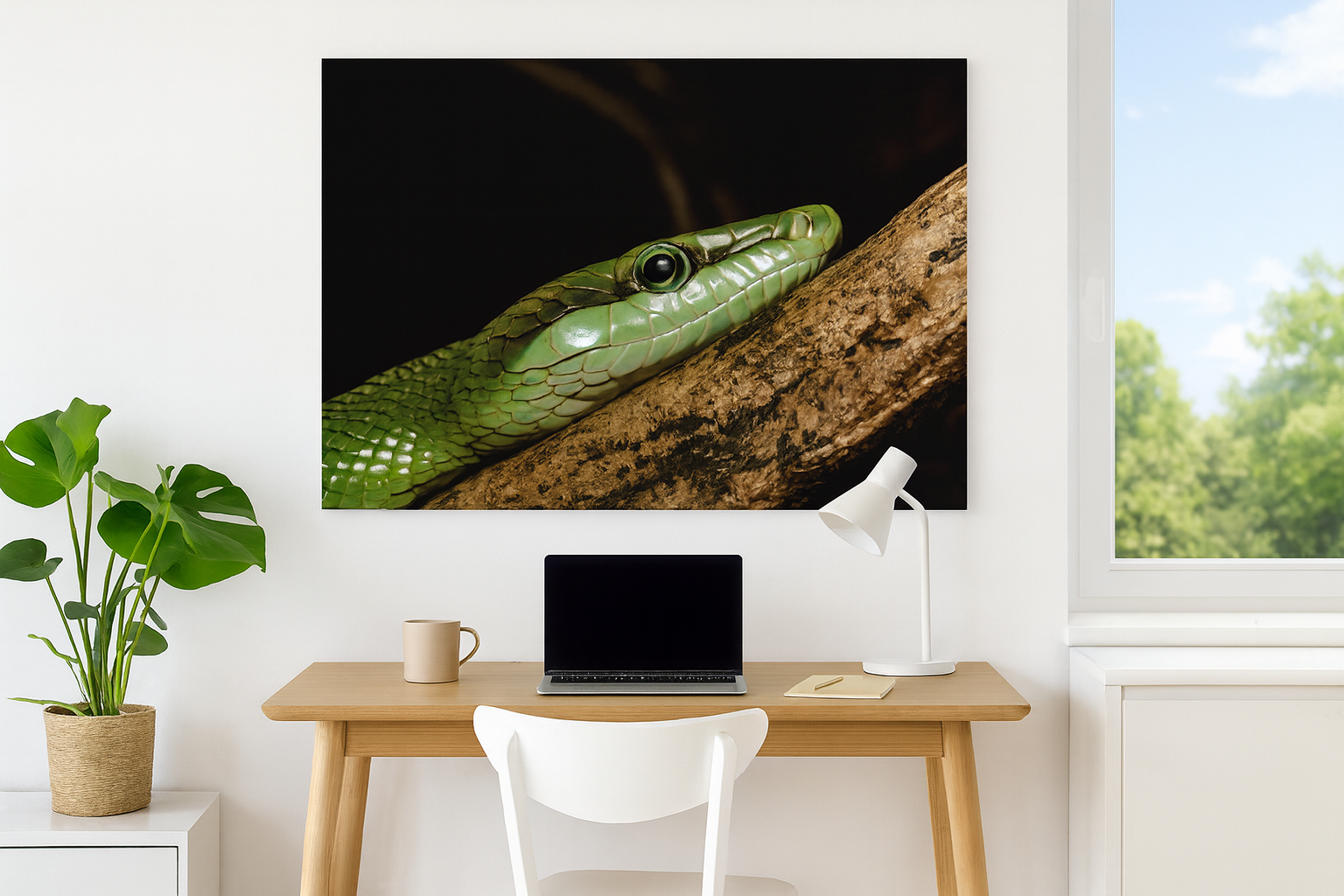 Dette eksklusive veggbildet fra Fotofryd fanger det magnetiske blikket til en rødhalet racer i et detaljert og kraftfullt nærbilde. Den sterke kontrasten mellom den grønne huden og den mørke bakgrunnen gir motivet en dramatisk og elegant tilstedeværelse. Et ekte blikkfang for deg som vil ha kunst som skiller seg ut og setter tonen i rommet.
