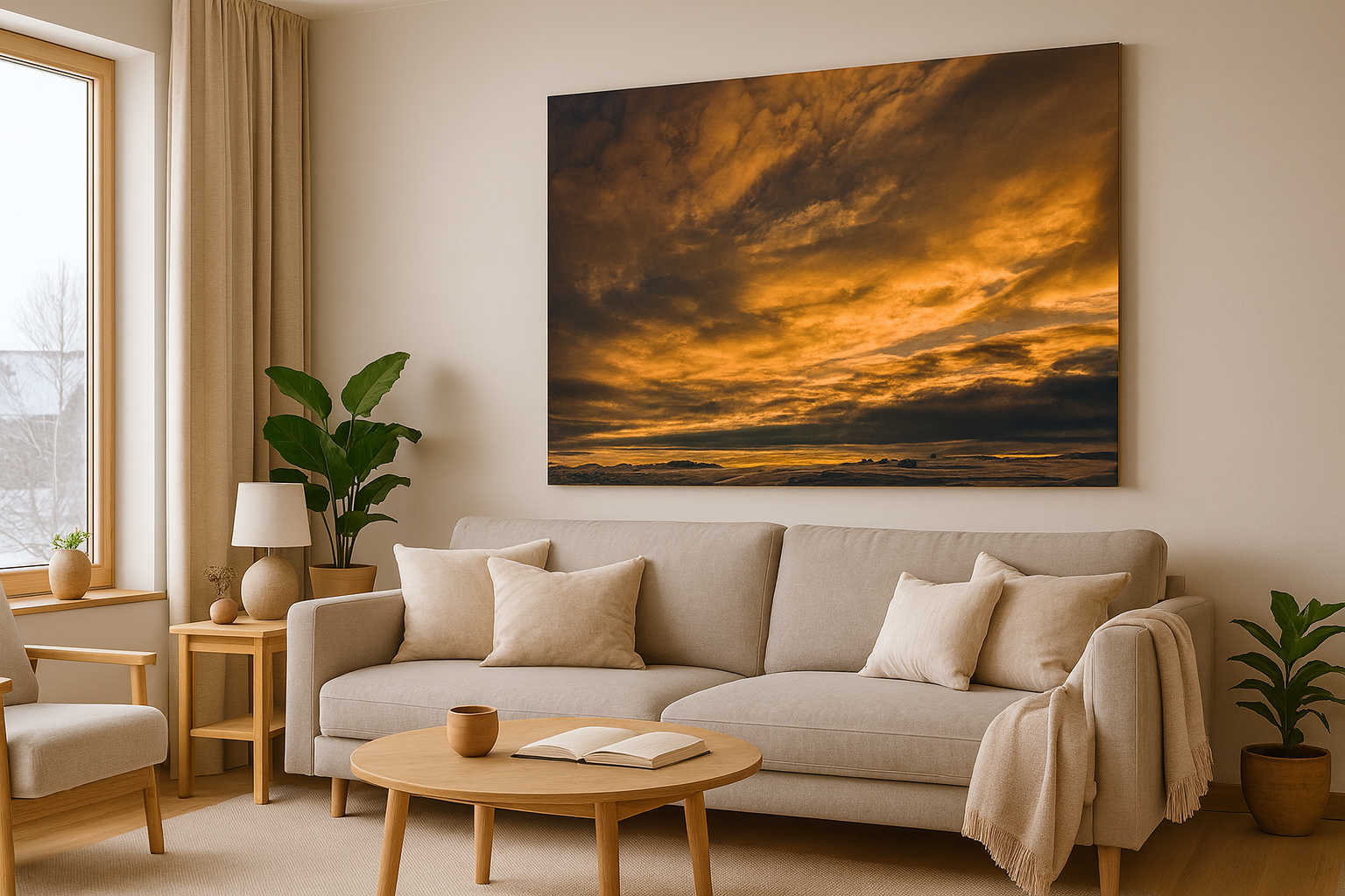 La naturens drama flytte inn på veggen! Dette stemningsfulle veggbildet fanger øyeblikket der solnedgangen maler himmelen i varme, gylne toner mens skyene legger til en mektig, nesten filmatisk stemning. Et tidløst blikkfang som skaper varme og ro i stue, soverom eller kontor.