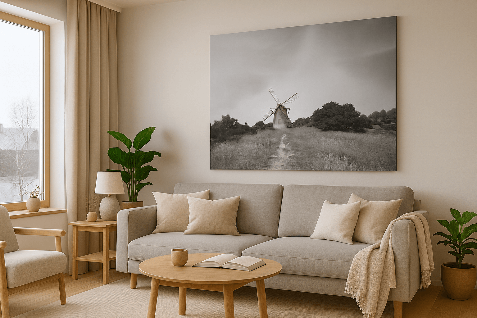 Dette stemningsfulle veggbildet tar deg med til et fredelig landskap der en historisk vindmølle står som et stille symbol på tradisjon, håndverk og nostalgi. Den svart-hvite tonen forsterker det tidløse uttrykket og gir rommet en rolig og sofistikert atmosfære.