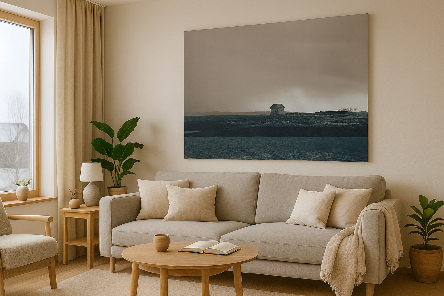 Dette kunstfotografiet fanger den rå, tåkemyke stemningen rundt en ensom hytte ved kysten. De duse fargetonene og det subtile spillet mellom lys og skygge skaper et uttrykk som føles både stillferdig og dypt. Et bilde som inviterer til ettertanke og tilfører rommet en emosjonell tyngde du kan kjenne.