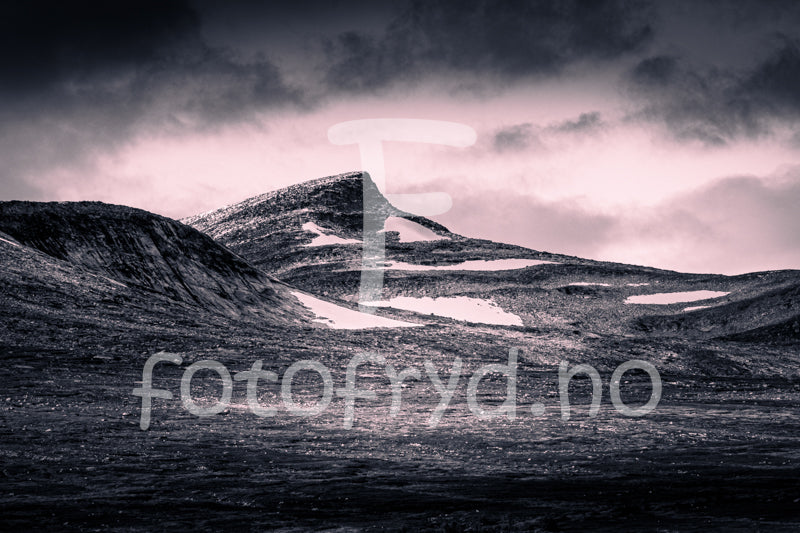 Dette dramatiske landskapsfotografiet fanger villmarkens intense nærvær. De mørke fjelltoppene som stiger mot en truende himmel skaper en stemning av både stillhet og storhet, som om naturen holder pusten et øyeblikk. Et ideelt veggbilde for deg som trekkes mot eventyr, kraftfulle naturskildringer og det ekte, urørte landskapet.