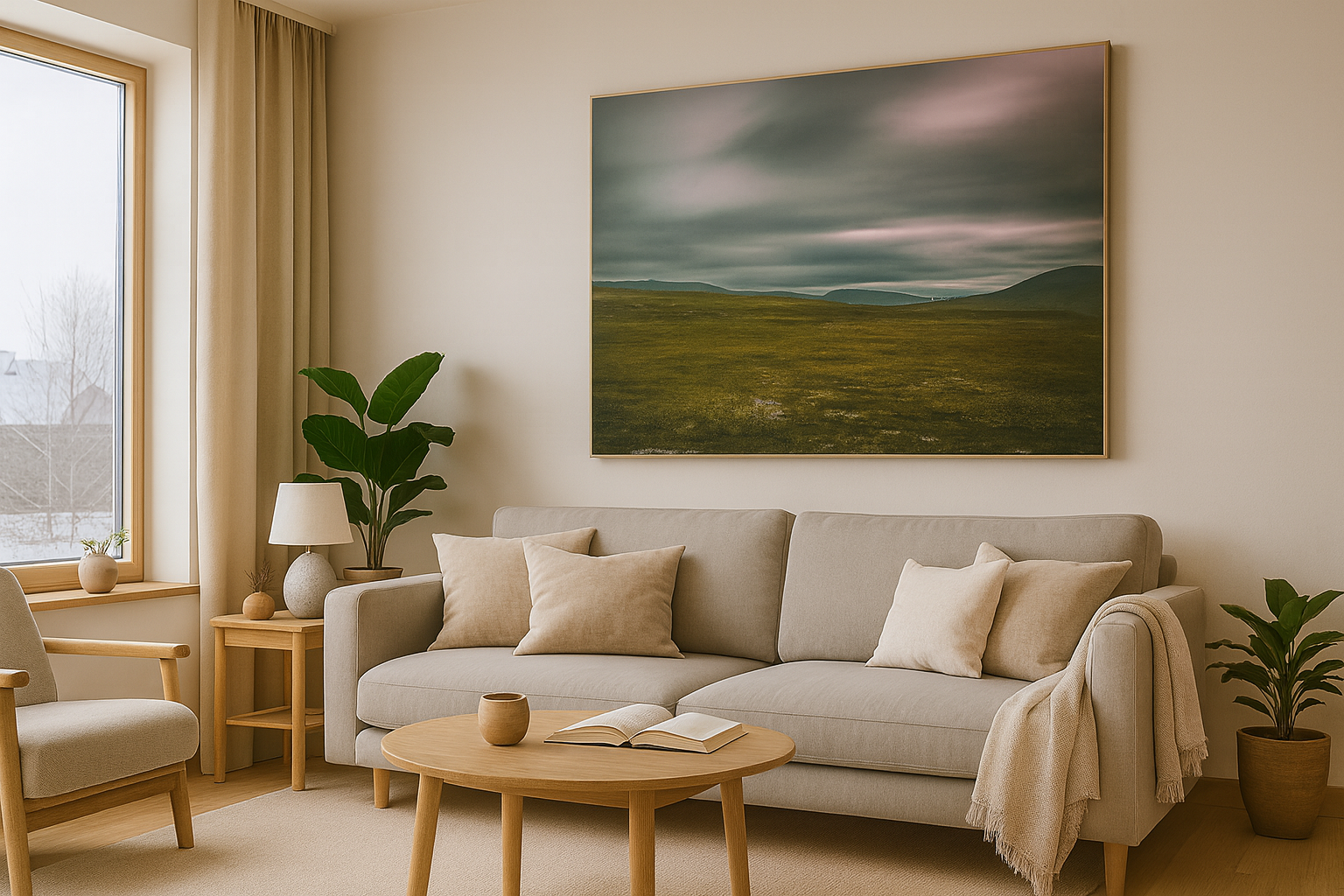 Dette stemningsfulle landskapsfotografiet fanger roen og kraften i naturens store vidder. Den dype grønne marken møter en dramatisk himmel i bevegelig lys, som gir bildet en følelse av både stillhet og uendelighet. Et perfekt kunstverk for deg som ønsker å ta med naturens skjønnhet inn i hjemmet.