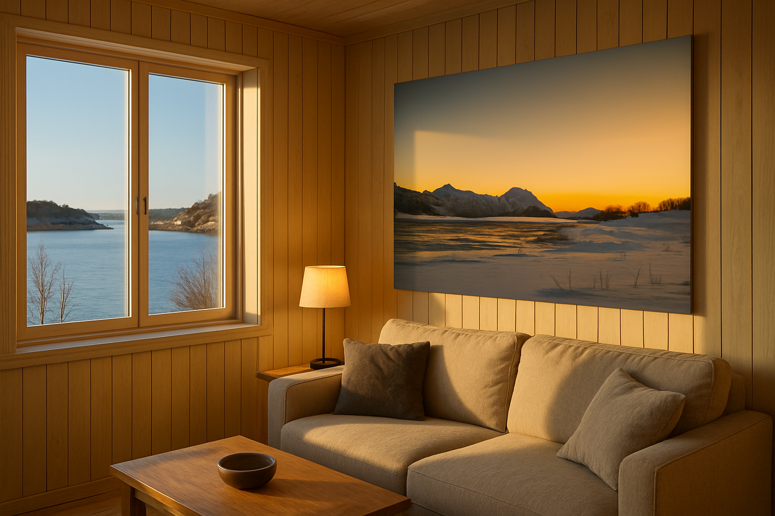 Dette kunstfotografiet fanger et stille øyeblikk av nordisk vintermagi. Den varme solnedgangen speiler seg i den islagte fjorden, mens fjellene i bakgrunnen reiser seg som en vakker kontrast mot de myke pastelltonene i himmelen. Resultatet er et motiv som kombinerer kalde og varme farger på en måte som gir rommet ro, harmoni og en følelse av vidde.